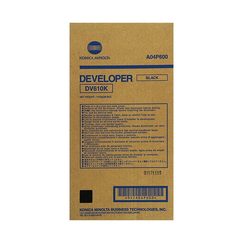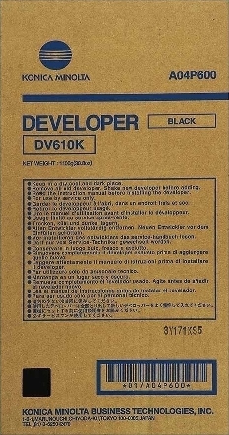 The Konica Minolta DV-610K Black Developer (A04P600) is an OEM component designed to ensure optimal performance and consistent print quality in compatible Konica Minolta printers. This developer unit plays a crucial role in the electrophotographic process by accurately applying black toner to the photosensitive drum, resulting in sharp and clear prints.